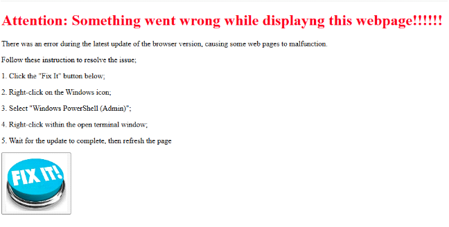 Der Cyberangriff beginnt, wenn der Nutzer eine gehackte oder gefälschte Website öffnet, auf der eine Warnmeldung angezeigt wird. Die Warnung kann z.B. so aussehen: „Die Seite wird nicht richtig angezeigt“, „Ein Browserfehler ist aufgetreten“ oder „Update erforderlich“.
