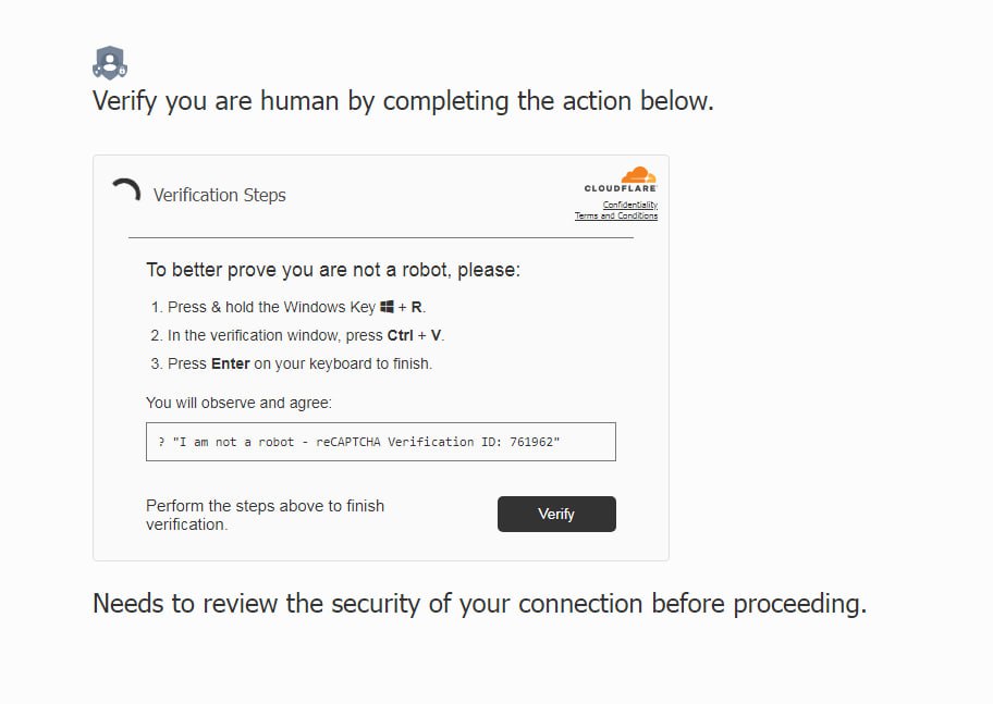 Ein weiteres Szenario von ClickFix-Angriffen ist die Nutzung gefälschter Captcha-Formulare. Auf dem Bildschirm erscheint ein Captcha. Im Hintergrund wird bösartiger Code in die Zwischenablage kopiert. Eine solche Tarnung erhöht die Wahrscheinlichkeit eines erfolgreichen Angriffs: Der Nutzer interagiert mit schädlichen Inhalten, da er glaubt, dass er damit beweist, dass er ein Mensch ist.